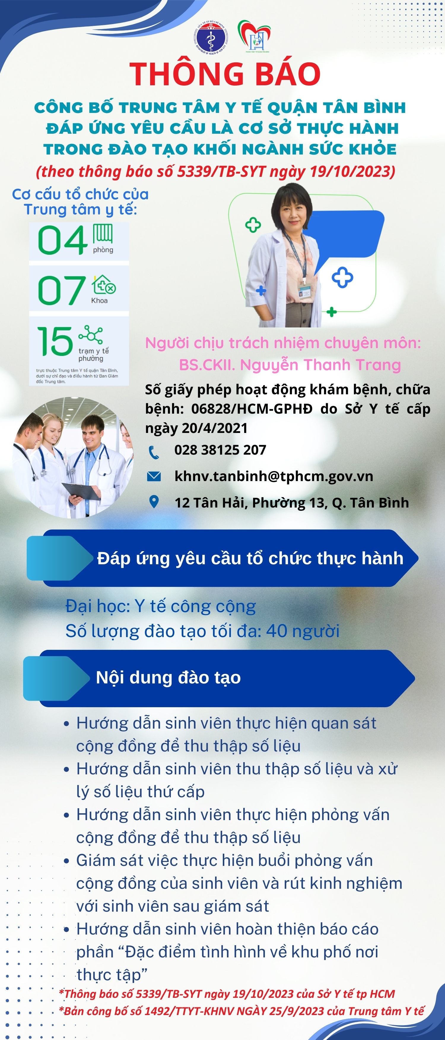 Thông báo công bố Trung tâm Y tế quận Tân Bình đáp ứng yêu cầu là cơ sở thực hành trong đào tạo khối ngành sức khỏe