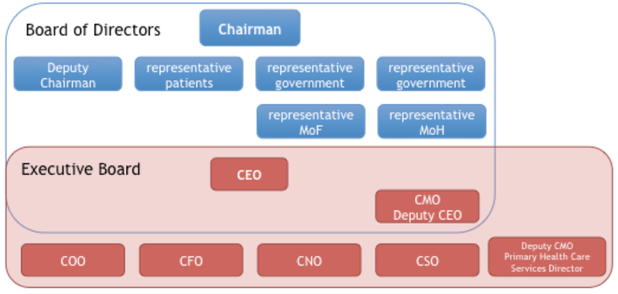 Cụ thể như tại Cộng hoà Síp, với sự hỗ trợ của các chuyên gia Ngân hàng Thế giới và Tổ chức Y tế Thế giới, quốc gia này đã chuyển đổi cấu trúc quản lý bệnh viện kiểu cũ sang mô hình hội đồng quản lý bệnh viện 2 cấp, theo đó, Hội đồng quản trị (Board of Directors – BOD) là hội đồng cao nhất, ngoài Chủ tịch và Phó chủ tịch, Hội đồng quản trị còn bao gồm các thành viên chính phủ đại diện của các Bộ (Sở) Tài chính, Bộ (Sở) Y tế, đại diện chính quyền địa phương, đại diện người bệnh (hội đồng người bệnh) và các Giám đốc và Phó giám đốc chuyên môn của bệnh viện. Dưới Hội đồng quản trị là Ban điều hành bệnh viện (Executive Board) bao gồm các giám đốc, phó giám đốc và các trưởng phòng chức năng như hiện nay.